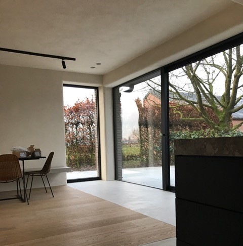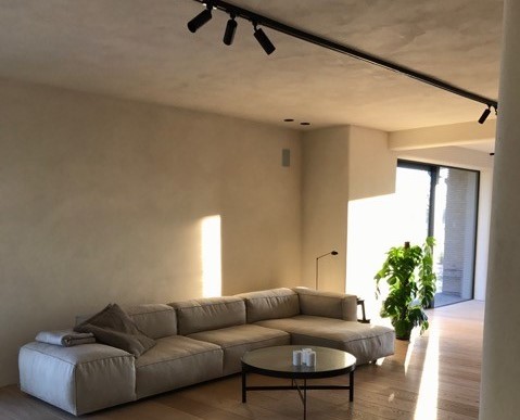 Niko Mysterious stopcontacten en schakelaars in geleemde muren, Qbus domotica met dimbare ledverlichting, ventilatie comfo D, luidsprekers multiroom weggewerkt in de muur.